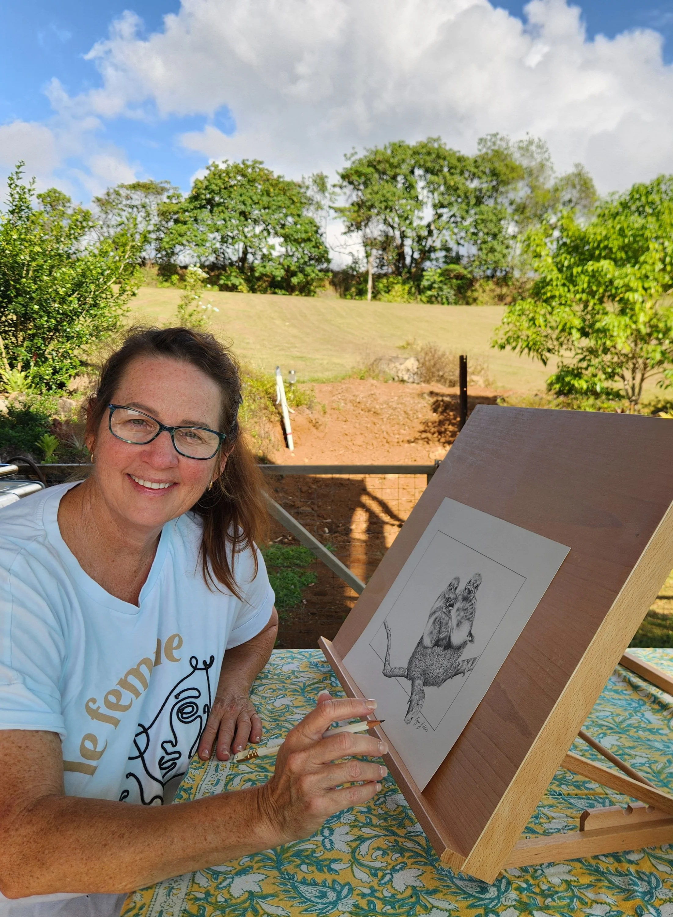 Karyn grew up in a tiny sugar farming town called Babinda, which is located in Far North Queensland, Australia. Babinda is known for being the wettest town in Australia and some of Karyn's fondest memories were of tubing down the creeks when in flood, hunting for yabbies in the creeks and the seasonal cane fires. She remembers a childhood where you only came inside to eat dinner. This has inspired her love of all Flora and Fauna and the outdoors, which is featured in a lot of her art.